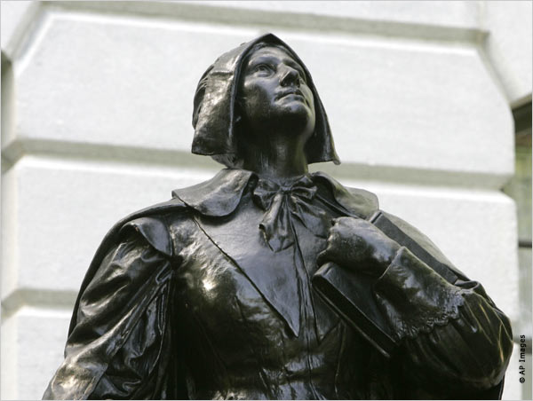 Hutchinson and her family came from England to the Massachusetts Bay Colony in 1634. The Puritans who controlled the colony believed that people could win salvation only by obeying the teachings of the Bible and the Puritan ministers. Hutchinson believed that people could communicate directly with God, without the help of a church or a minister. She held meetings in her home to explain her beliefs and began to attract supporters. The colony’s governor, John Winthrop, and the Puritan clergy saw Hutchinson as a threat to their church. They tried her for heresy (denying the teachings of the church) and forced her to leave the colony in 1638.