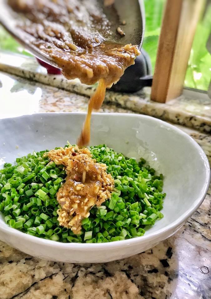Pour the fried shallot or fried garlic mixture over a bowl of green onions. Mix well.