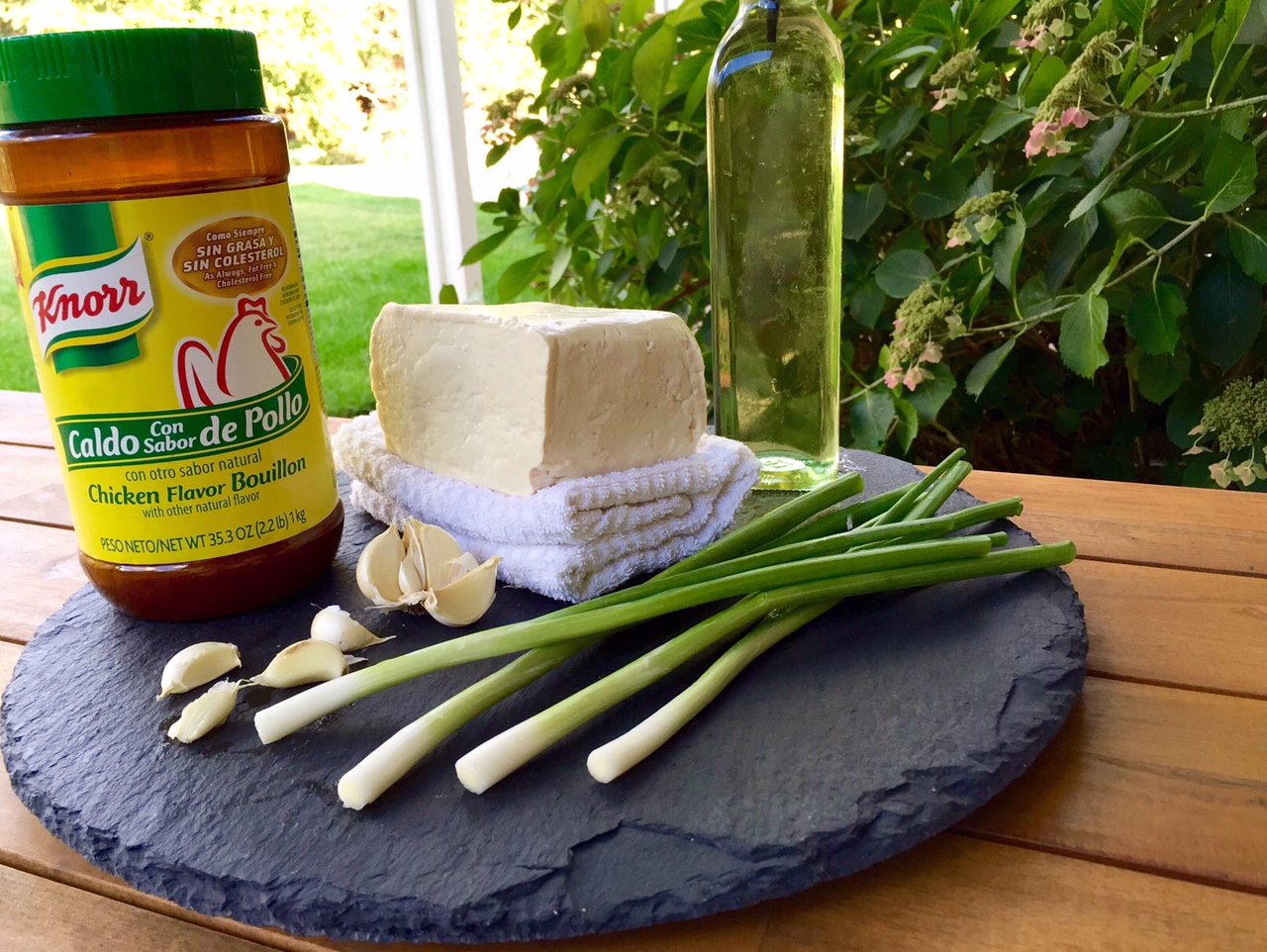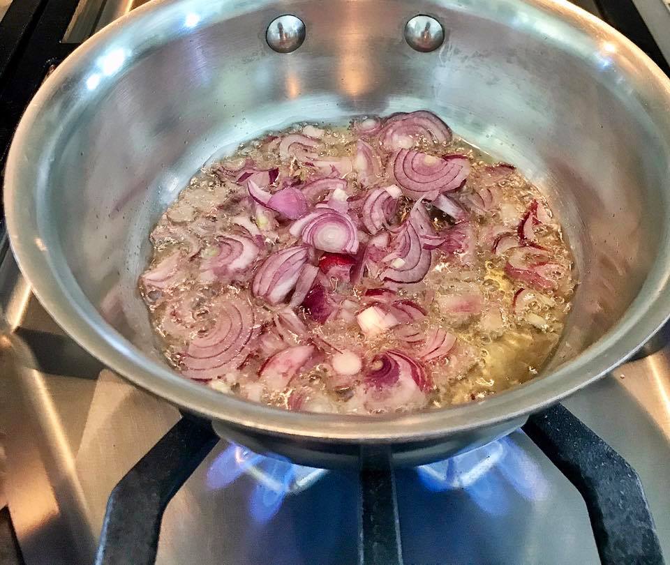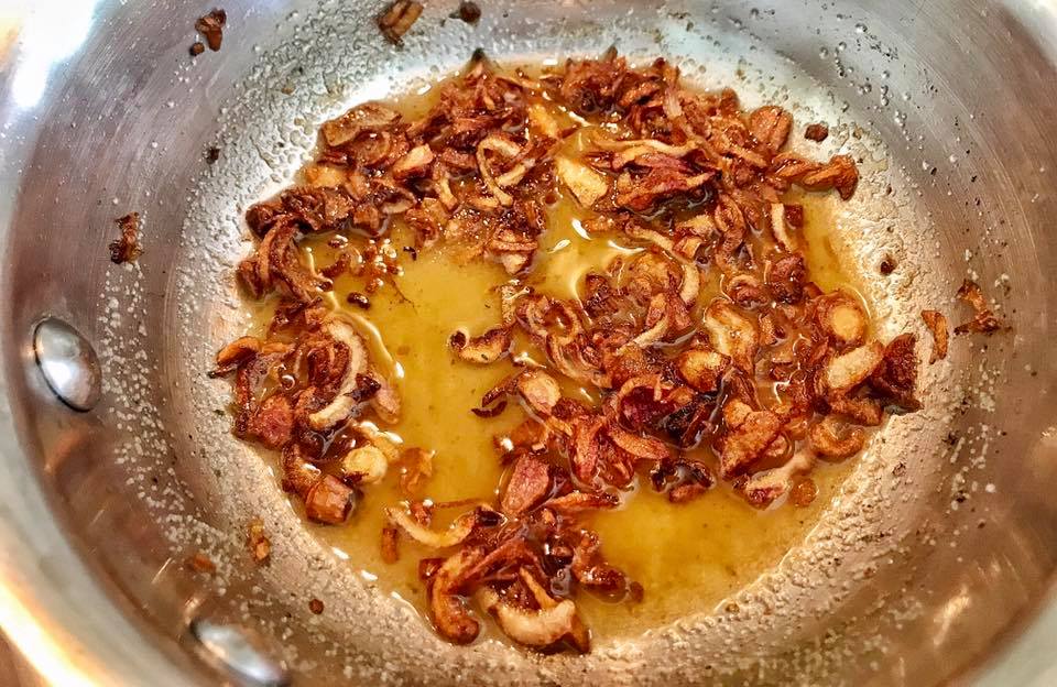 Put about a tablespoon of olive oil and garlic or shallots (I prefer shallot) in a sauce pan over medium-low heat until the garlic or shallot begins to turn pale gold. Turn off the heat. Continue stirring until the color deepens.  Add chicken bouillon powder, and sugar in the hot oil and mix well.