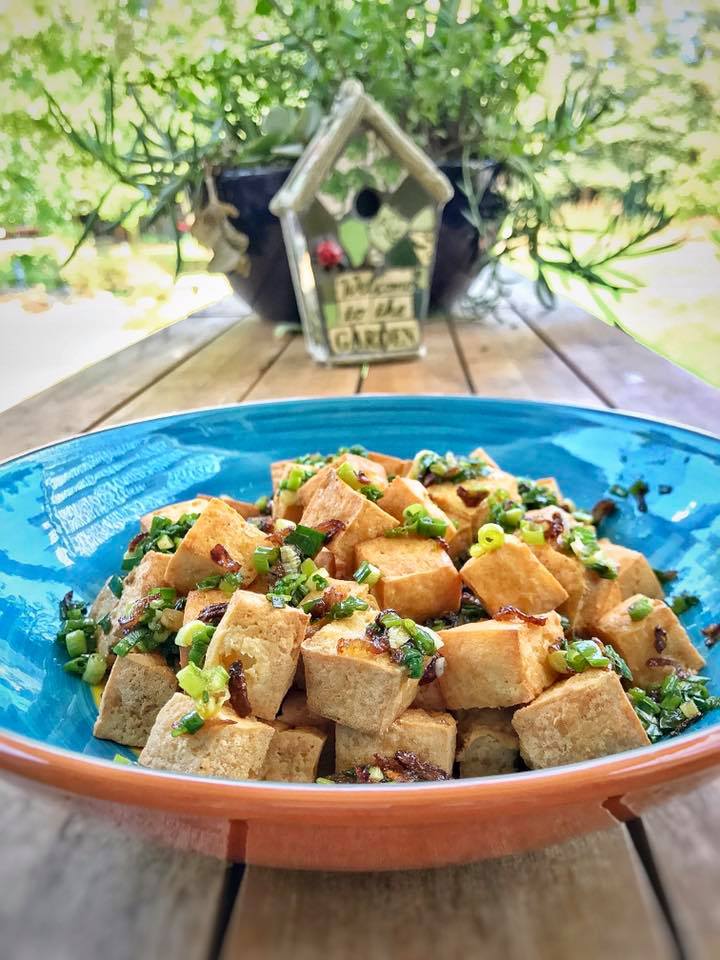 Blot dry tofu with a clean dish or paper towel to avoid splattering. Carefully add the tofu cubes to the pan. Don’t crowd the pan. Do not flip tofu too soon as it will break apart. Let it cook until the edges start to look brown. Flipping the tofu occasionally to prevent tofu from sticking to pan and also to ensure that all sides of the tofu are golden brown.
