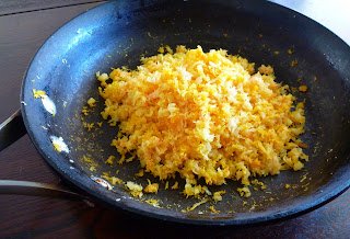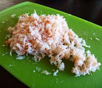 Place a frying pan on low heat, add the crushed shrimp. Season lightly with about 1/2-1 teaspoon fish sauce or a dash of salt and pepper. Use a spatula to stir and press the shrimp down for 5 minutes or until shrimps are completely dry and bluff.Add annatto oil to enhance the beautiful orange color of cotton shrimp. Stir it well for another couple of minutes. Turn off heat and continue to stir fry for a further a minute.