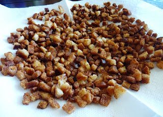 Bring a frying pan with 1-2 tabespoons of oil to medium heat. Add pieces of sandwich to the hot oil. Remove the croutons with a strainer when they are turning golden. Place croutons on a paper towel to absorb the excess of oil. If prefer Fried Fat Pork (Tép Mỡ), click here for recipe.