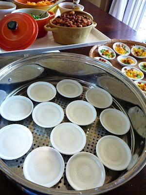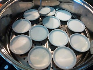 Place scallions and a dash of salt in a bowl. Heat a small sauce pan with 1 tablespoon of oil. When hot, pour the hot oil into the scallions bowl. Mix it well. Set aside.Steaming Bánh Bèo
