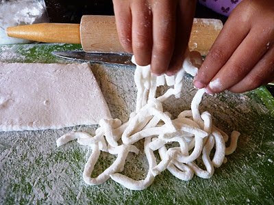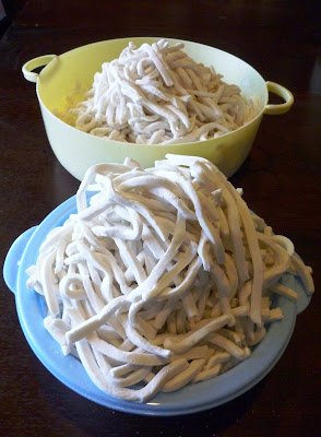 Cut it into thin stripes and separate noodle strings with a little bit of flour immediately to prevent from sticking together.