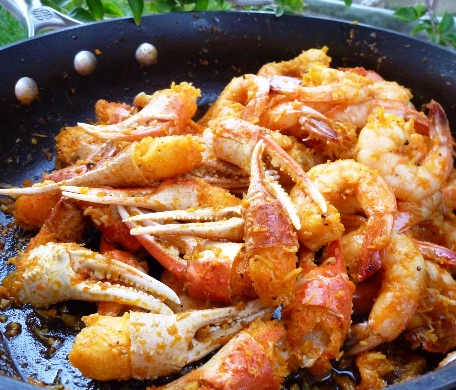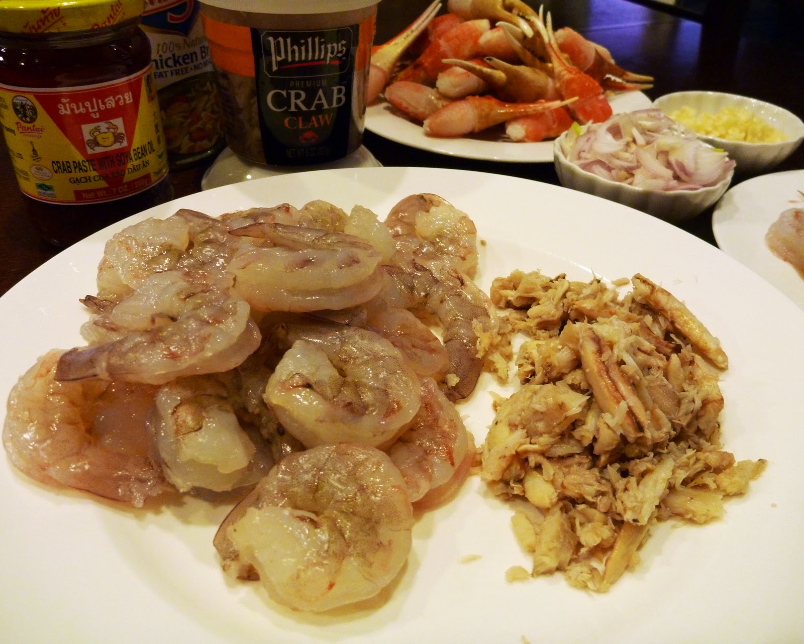 Add shrimp, crab claws, crab meat and crab paste in soy bean oil, fish sauce and pepper. If you have the gooey stuff from fresh crab, add it in. Stir and cook for until shrimps are cooked. Set aside.