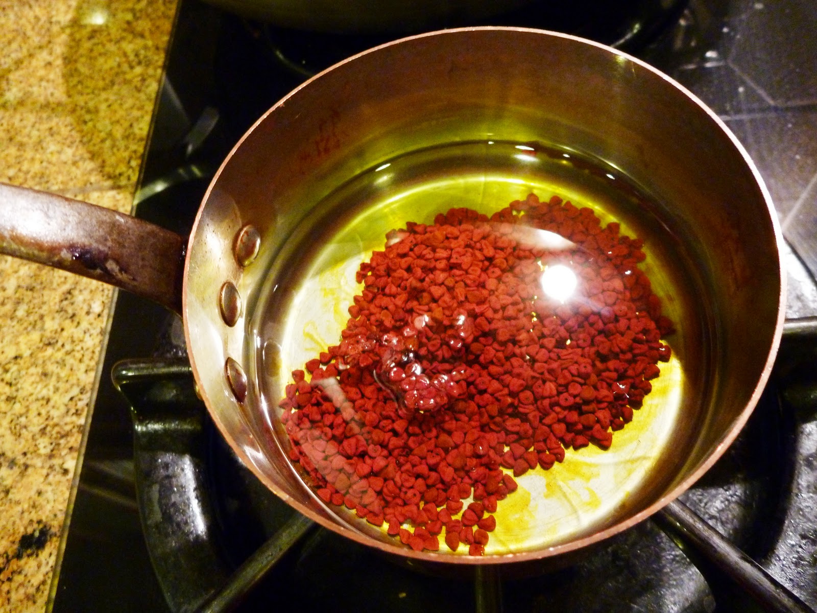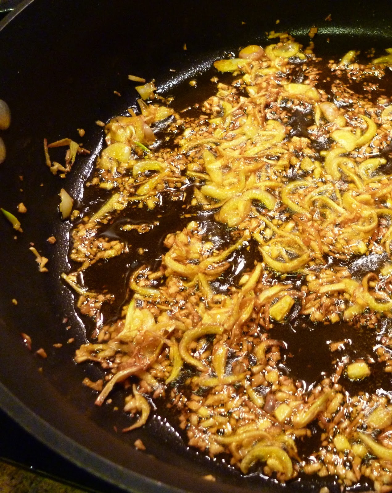 In a large pan, heat 1/2 annatto oil and saute garlic and shallots until fragrant and lightly golden brown.