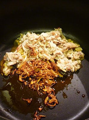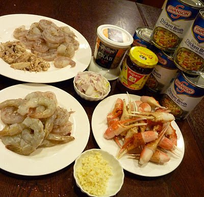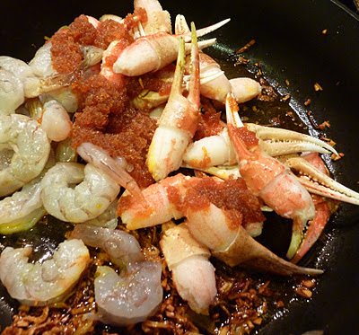 Add shrimp, crab claws, crab meat and crab paste in soy bean oil, fish sauce and pepper. If you have the gooey stuff from fresh crab, add it in. Stir and cook for until shrimps are cooked. Set aside.