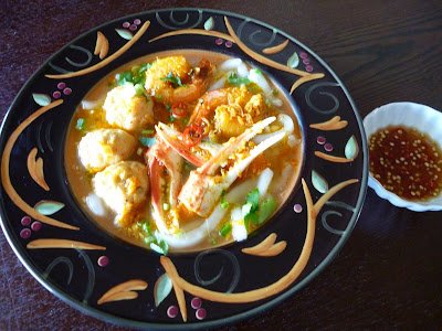 One of my fondest childhood memories was having a delicious steamy bowl of bánh canh for breakfast sold by a lady who always sat at the same spot nearby my elementary school; her specialty was bánh canh chả cá (fish patty rice noodle soup). In the afternoon, there was another lady who made a wonderful bánh canh giò heo (pork hock rice noodle soup). I love both types of these bánh canh. You have to realize that it’s extremely difficult for me to not eat out as food vendors permeate every corner of my hometown Pleiku.