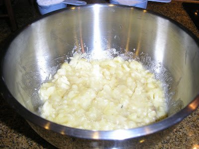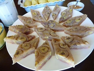 Tonight, right after the dinner, I started to work on this dessert. It took me about 1 1/2 hour to get everything done. There was one thing that I forgot in preparing this dessert. I forgot to add some yellow color to enhance the bland appearance of the Bánh Chuối (Banana Cake).