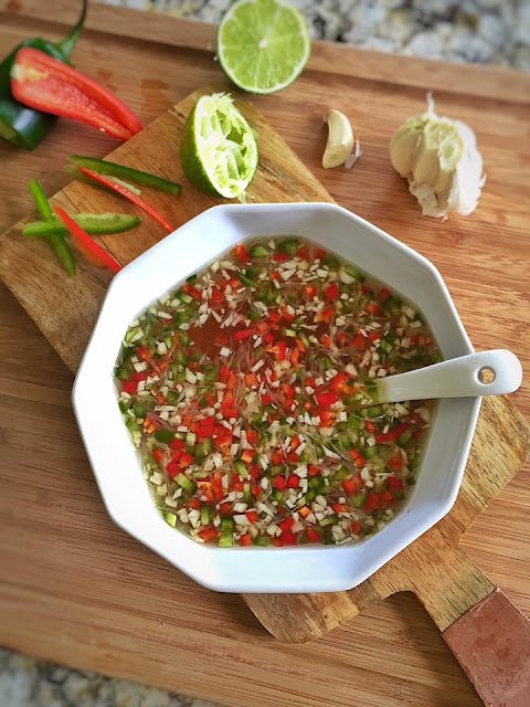 Combine all the ingredients for the fish sauce dressing and mix well. The purpose of adding finely diced red and green sweet bell peppers to the fish sauce dressing is to add sweetness and appeal.