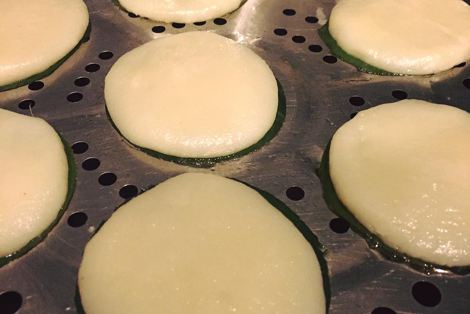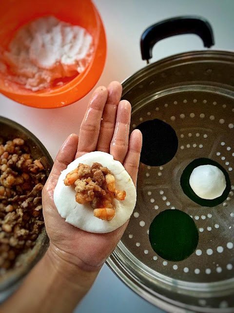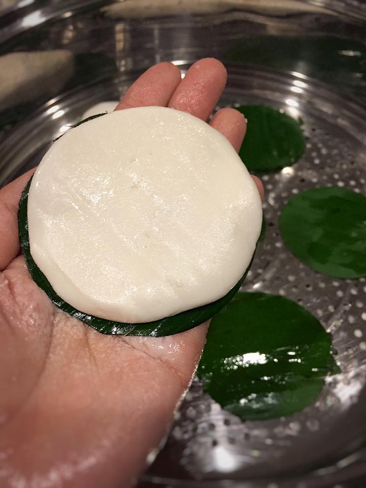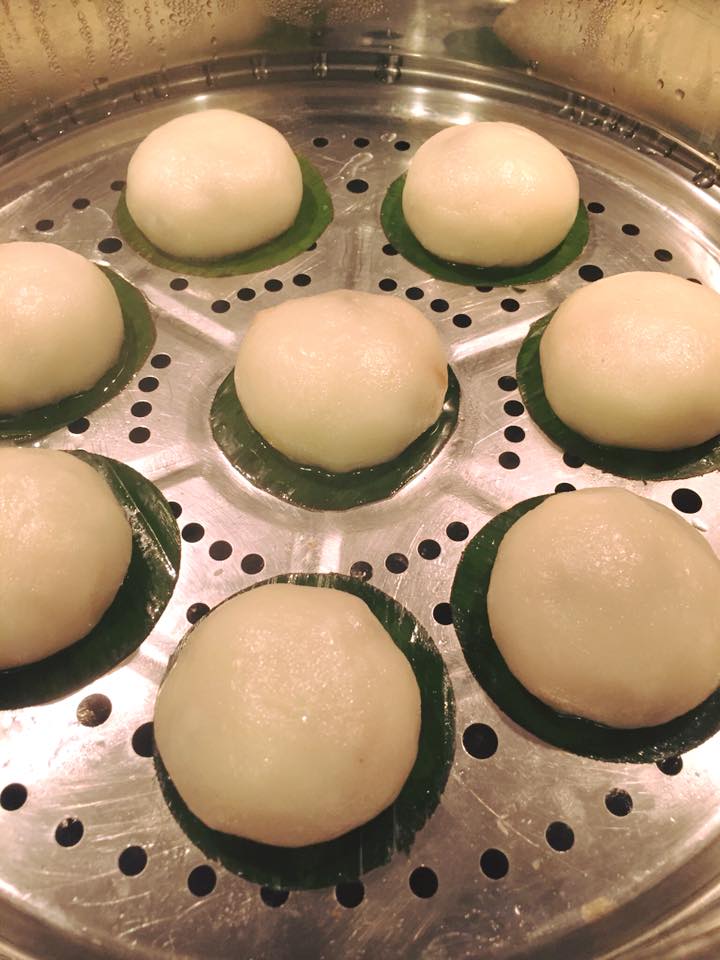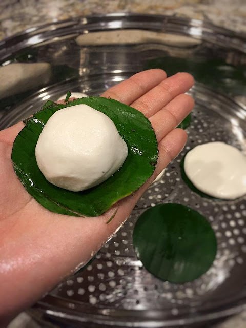 Forming Dough for Steam Dumplings – roll each ball into a smooth ball in the palm of your hands and flatten into a thin flat round. Put about a teaspoon of filling onto the center of the dough and bring up the edges of the dough to cover the filling completely. Roll it gently in circular motion with the palm of your hands to smooth out the surface of the ball. Set the ball on a banana leaf circle.