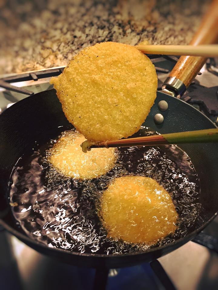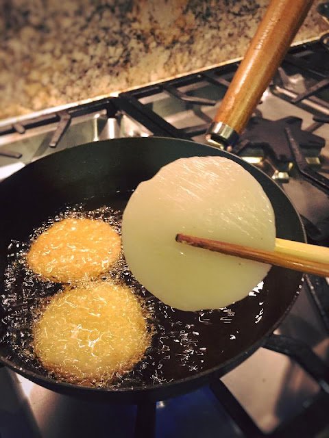 In a pot or a skillet, bring oil over high heat. Once the oil is hot, add the steamed flat cakes to the hot oil and fry until golden brown on both sides. It’s important not to fry it too long to maintain a soft center and a crispy cover.