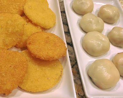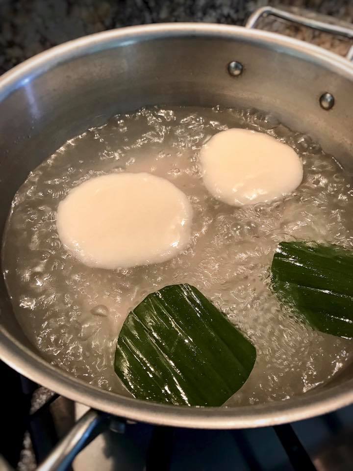 Boiling – it is not necessary to use banana leaf circles in this boiling method. Bring a large pot of water to a boil. Drop the dumplings and cakes into the boiling water and cook in gentle boiling water until they rise to the top. Let them cook for another minute to ensure they are cooked through, then lift out with a slotted spoon. Place dumplings and cakes onto a lightly oiled plate to prevent them from sticking to the bottom of the plate.