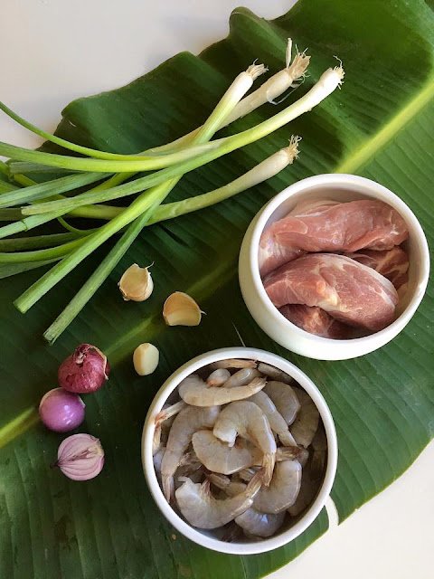 In a skillet, bring a tablespoon of oil over medium high heat. Add in sugar, white part of onion, garlic, and shallot, stirring until fragrant. Add pork, mushroom, if used, and stir a few minutes until the pork cooks half way. Add shrimps, fish sauce, and ground pepper, stirring well. Saute for a few minutes until the sauce becomes thick and coats the pork and shrimps and the color changes to brown, remove it from heat. Taste and adjust the seasoning for a good balance of sweet, and salty.