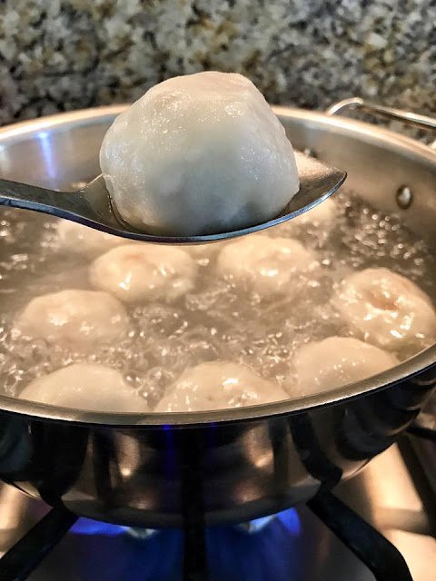 After several experimentation with various types of potato, tapioca, rice and sweet rice flour – and a severe burn on my hand to show off – I am satisfied with the dumpling’s texture.