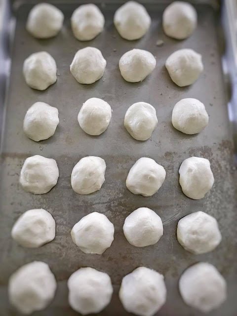 Rub a little cooking oil on your hands to keep the dough from sticking. Divide dough into 24 balls for steaming and frying.