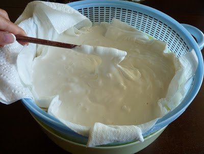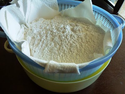 Add about 3 cups of water into the flour. Use a spoon to mix it until the water mixed well with flour. Cover the colander and let the water drip into the large bowl for about a couple of hours or until flour is no longer liquidy.