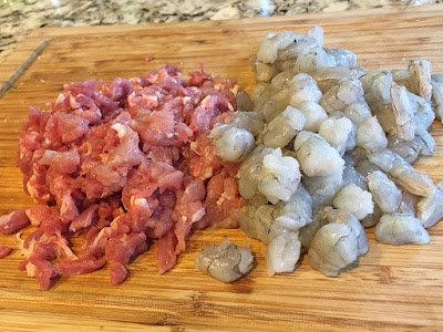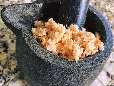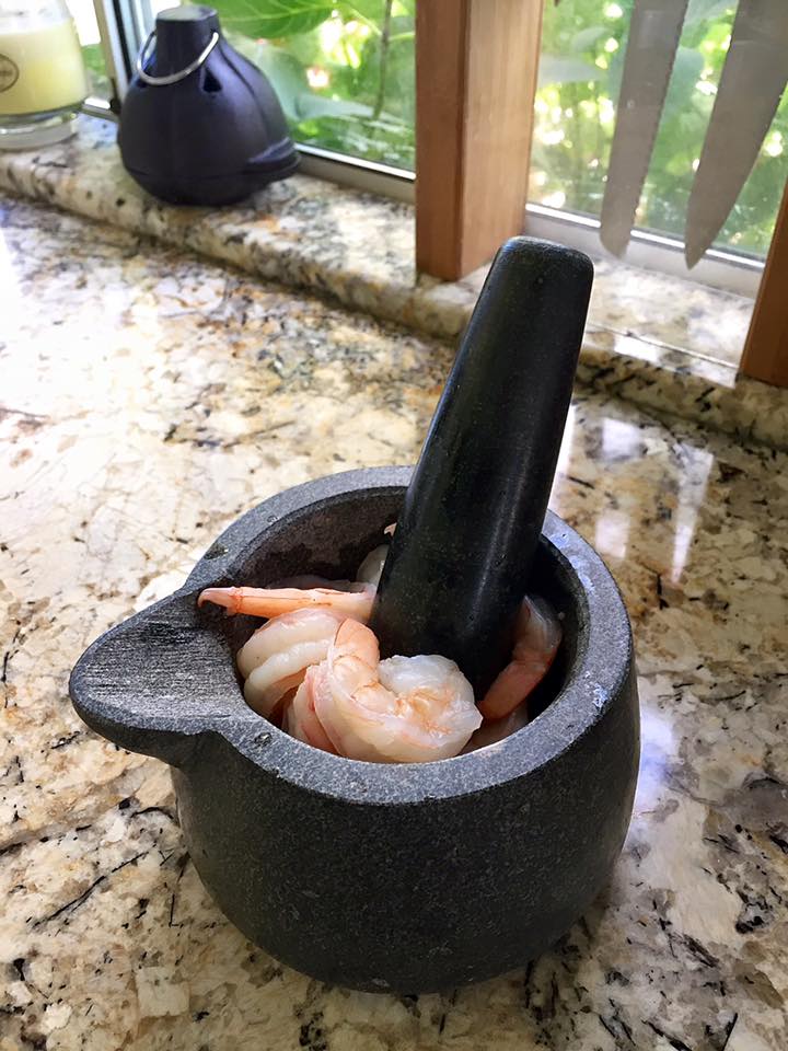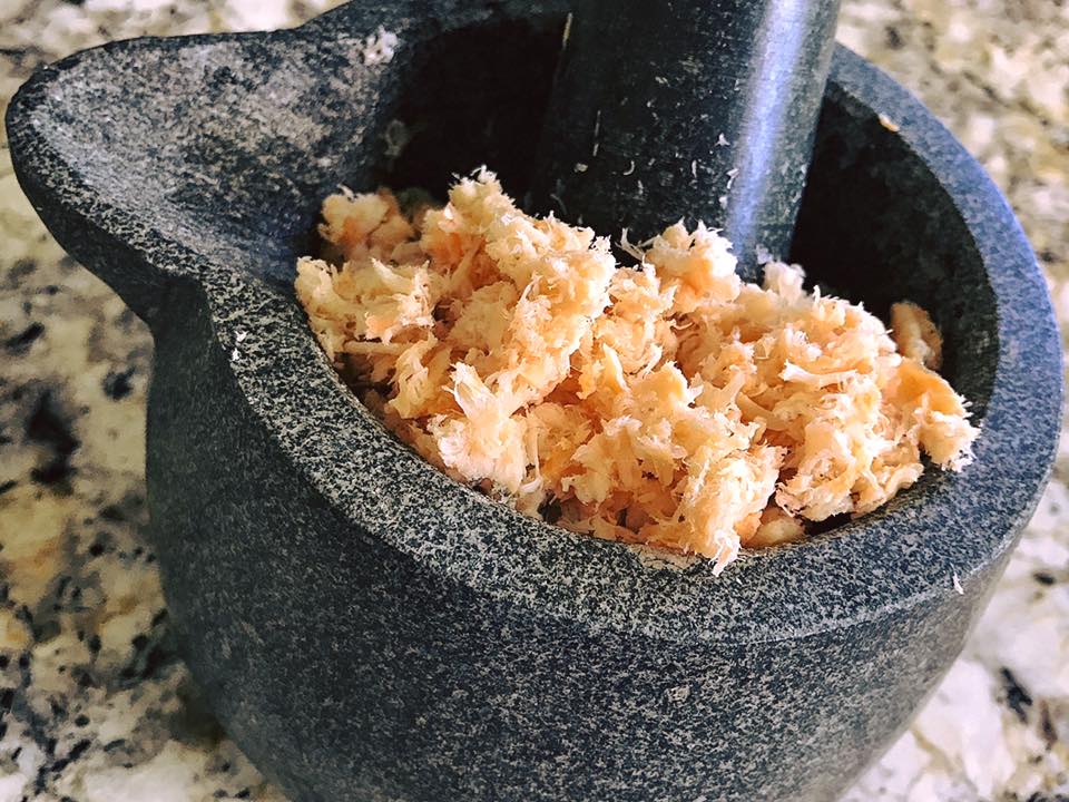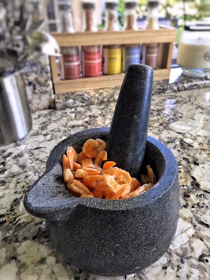 Preparing fresh shrimps – bring water to a boil. Add shrimps and cook for a minute until shrimps turn pink. Remove shrimps, peel, and smash shrimps with a meat tenderizer or the back of the knife. You can also pound shrimps into a coarse paste with a mortar and pestle.