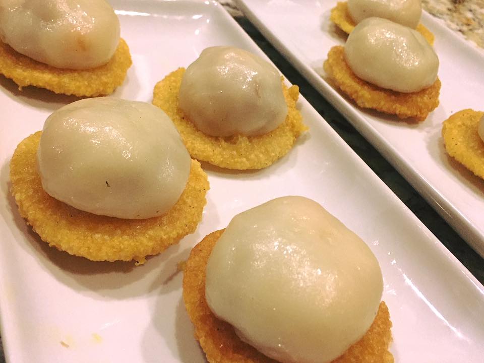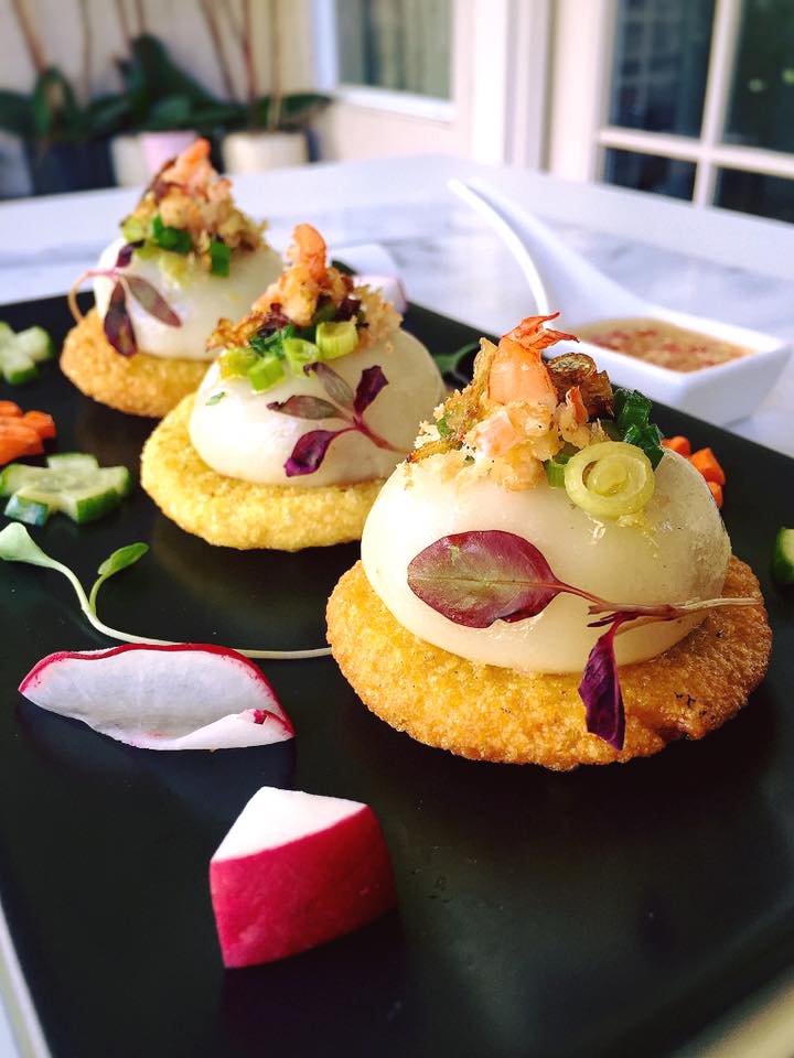 Place a steamed dumpling on top of a crispy cake. Top with green onion oil, fried shallots, and minced shrimps.
