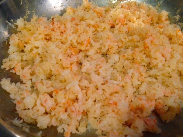 Place a frying pan on low heat, add the crushed dried and fresh shrimps. Use a spatula to mix the shrimps for about 5 minutes or until shrimps are completely dry and bluff. Season it with a dash of salt, or fish sauce, if preferred. Set aside.