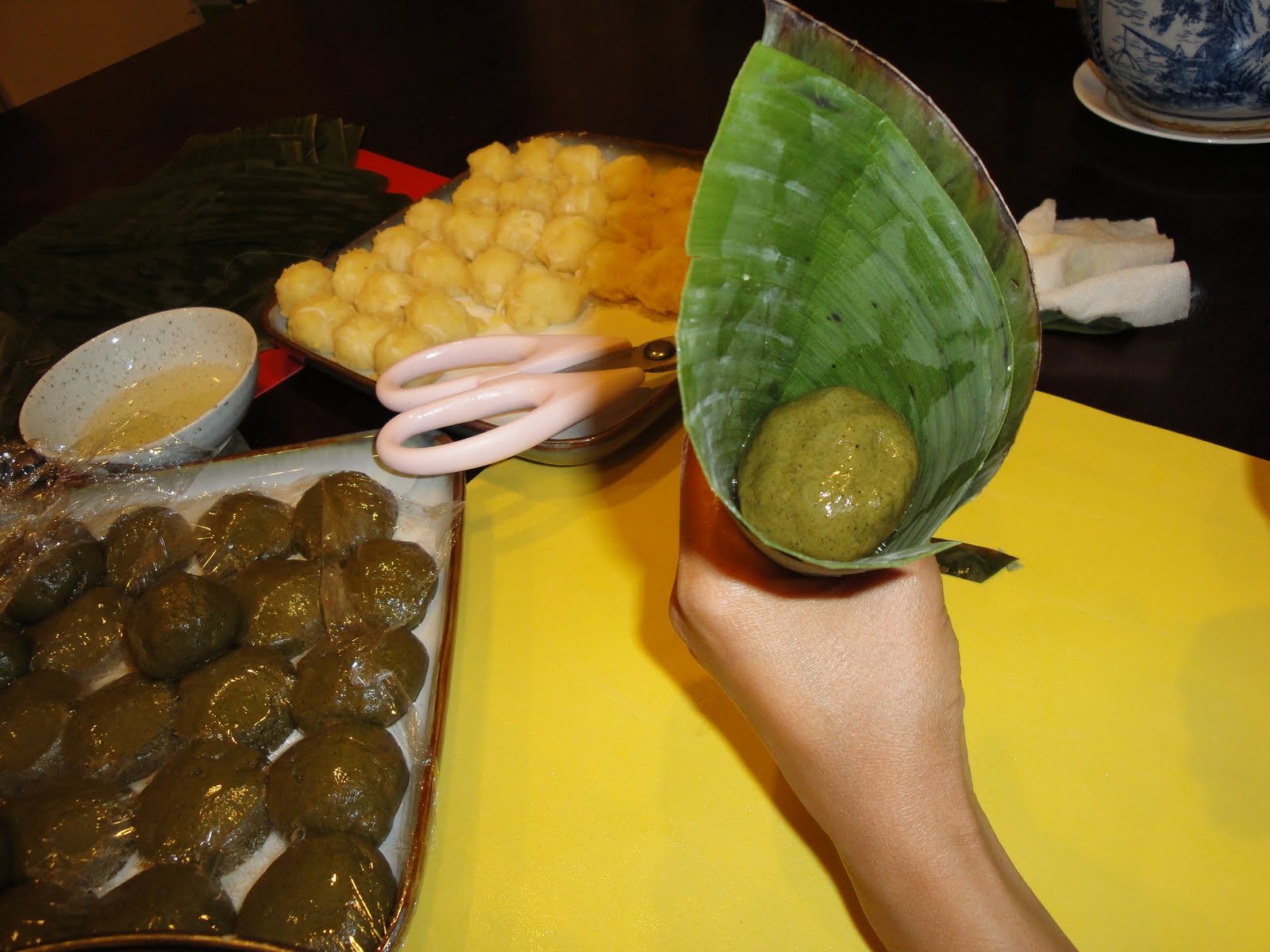Close the dough and roll it with your palms to make a ball. Brush oil all over the ball before wrapping it up, so that the cake will not stick on the banana leave after steaming it.