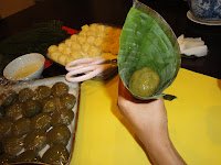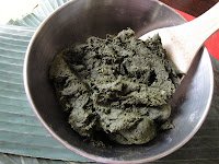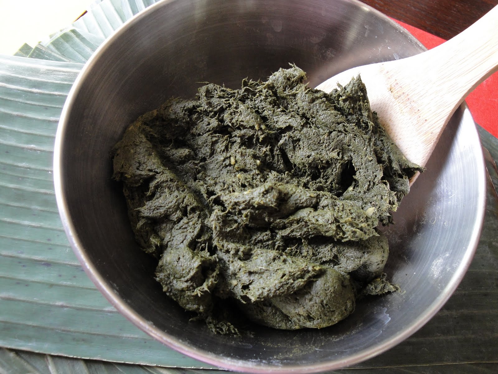 I’ve always been fascinated by how banh it la gai gets its black color as I  had never seen it my entire life  untiil recently.  Sometimes in March this year, I was lucky enough to receive some Gai plants from my mother-in-law’s friends. I was determined to make my first batch, but it would have to wait for three months until the first gai plants are ready for harvesting.   The Gai leaves are green but after you ground in a mortar or blend it, its green colour will turn dark green.  Once you steam the cake, the colour will turn black just like the color of  Banh It La Gai that is shown above from my first batch.  The process of making Banh It La Gai may not look appetizing but the finished product is quite pleasing to the palate.