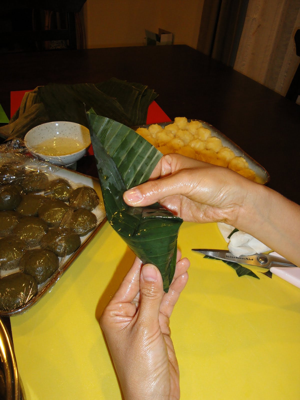 Fold a piece of banana left into a cone shape. Drop the ball dough into it.  Fold in four sides.
