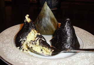 Binh Dinh is the land of  Banh It La Gai,  which is made from the five main ingredients: glutinous rice flour, gai leaf, sugar, mung bean and banana leaf.  Banh It La Gai has the sweet taste of sugar, the aroma of sweet rice, the spice of ginger, the starch of mung bean, bitter taste of gai leaf and the grassy perfume of banana leaf.  All of these ingredients bring out a refreshing flavor and a distinctive glossy deep black color that gives the cake its unique color.