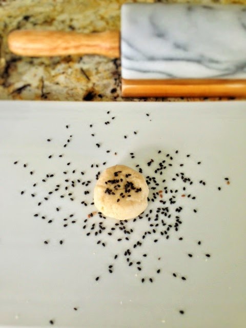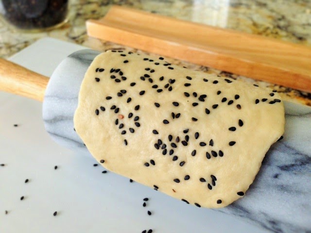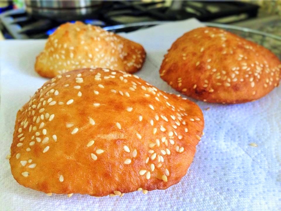 On the work area, sprinkle some sesame seeds then place a dough ball on top of the sesame seeds. Sprinkle some more sesame seeds on top of the dough and roll it out flat into round disk.  If the dough sticks to the rolling pin, dust the rolling pin with flour.  The thinner you roll it out the more hollow the bread gets when frying it.