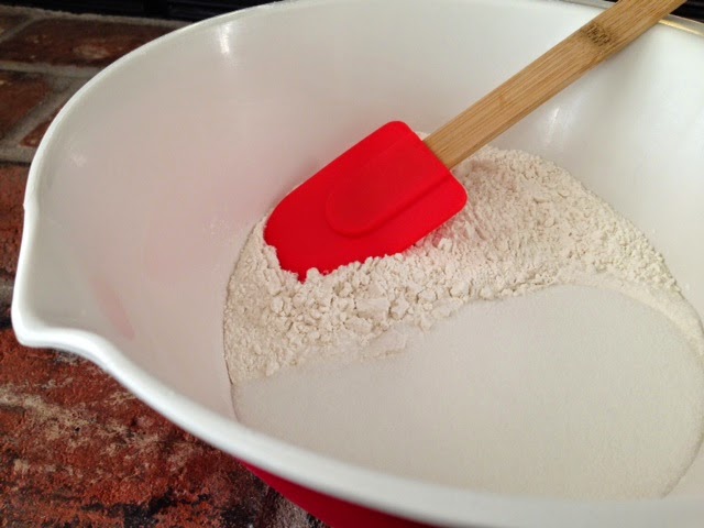 In a large mixing bowl combine flour and sugar, mix well.