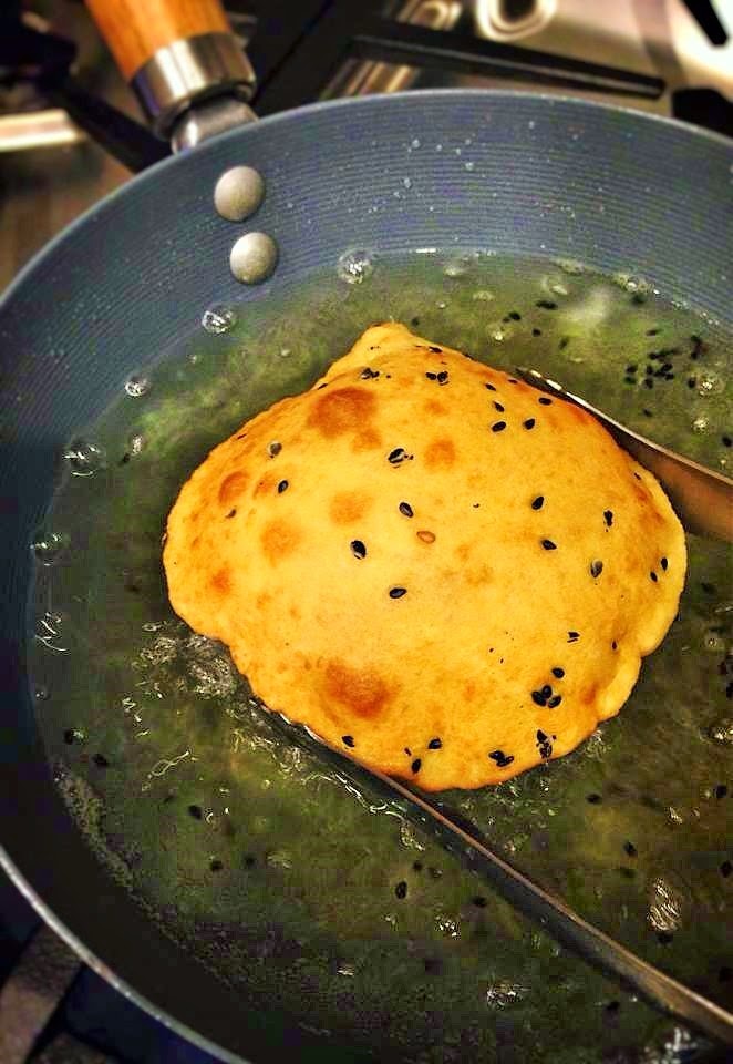Carefully drop a dough disk into the hot oil to prevent splashing.  Use tongs or chopsticks to push the dough down into the oil to help puff up the dough. As soon as the dough starts to puff up, flip it quickly back and forth until it’s golden brown and evenly puffed. The dough turns brown really quickly and burns easily if you don’t pay attention .