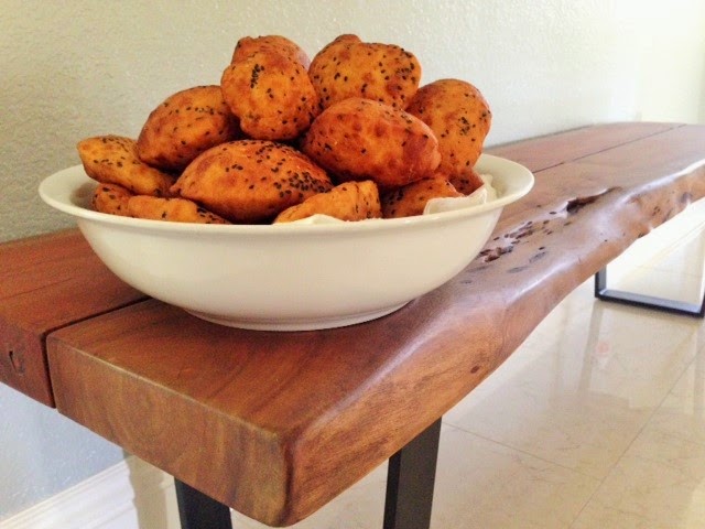 Bánh tiêu is one of those comfort snacks that I enjoy during a cold, rainy day.  Once a dough ball , covered in sesame seeds, is rolled out into a flat disk  and dropped into a pot of hot oil, it pops up like magic, creating a hollow bun.  The golden brown bánh tiêu, slightly sweet and crispy on the outside with a mildly chewy texture, carries a wonderful aroma when the sesame seeds burst in your mouth , making it so addictive. I wonder what it would be like with poppy seeds!