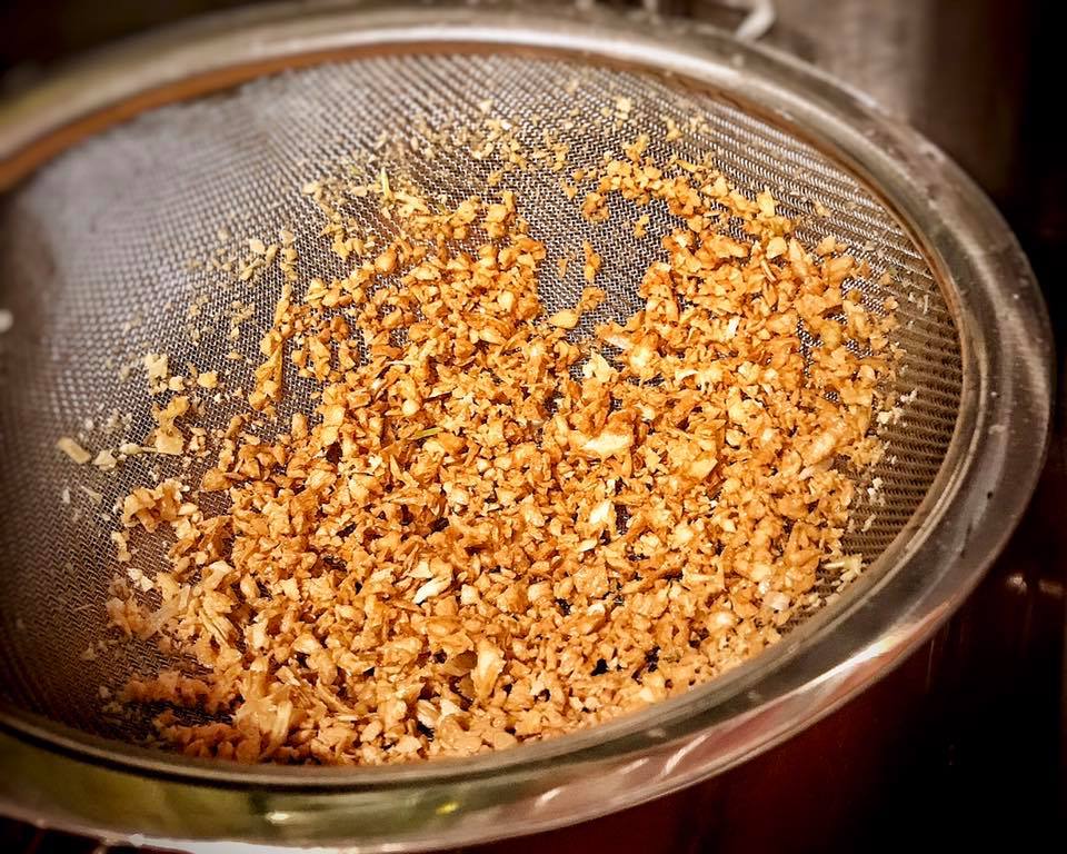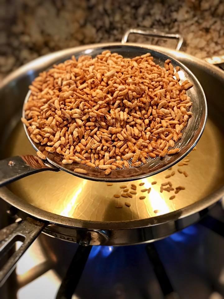 Repeat the process with the rice. Once the grains of rice are popping and turns golden brown, carefully use a strainer to remove the popped rice from the hot oil. Place the popped rice on a paper towel to allow any excess oil to be absorbed.
