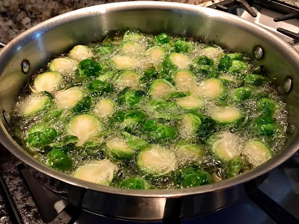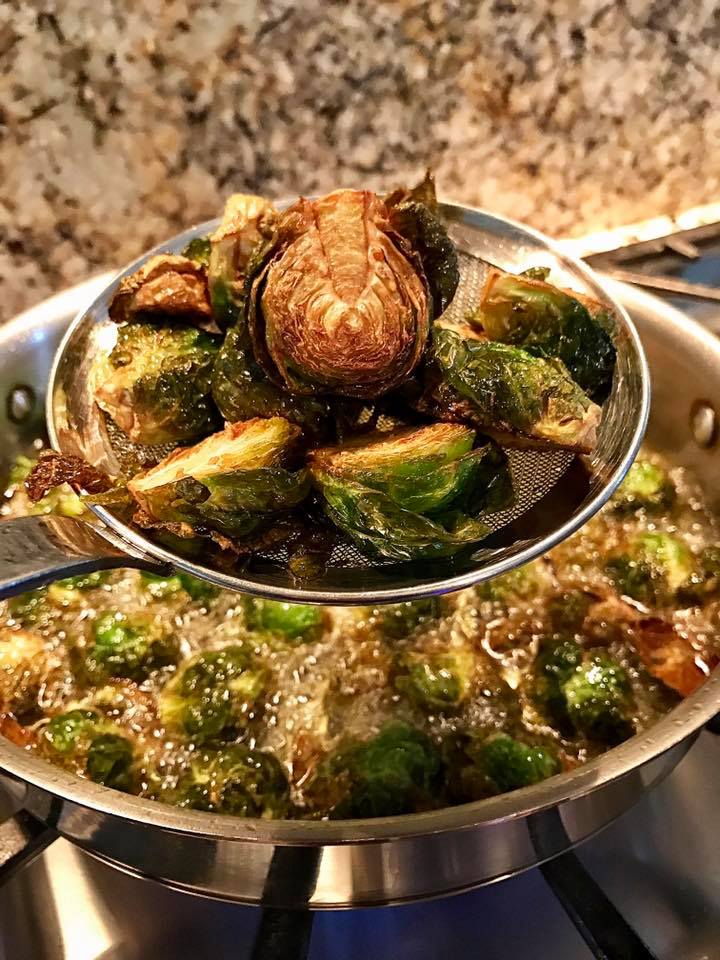 In a pot or deep pan, heat oil on medium high. When the oil is hot or reach 400°F, add brussels sprouts and shallots. Oil temperature will drop, so adjust heat to maintain this temperature. Be careful, as the oil can splatter. Fry and stir with a slotted stainless steel spoon until brussel sprouts have a nice golden brown color; usually takes about 3 minutes. Transfer to paper towel-lined plate to drain any excess oil.