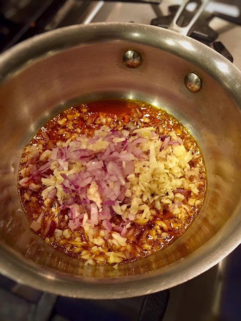 Heat about 1/4 cup annatto oil in a small pan over medium heat. Add the remaining shallots, garlic and stir until fragrant and slightly golden brown.
