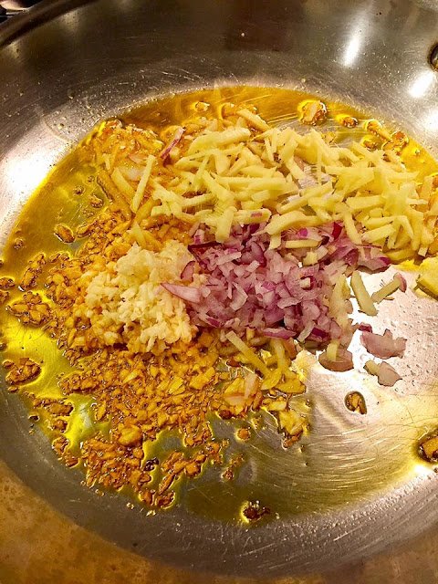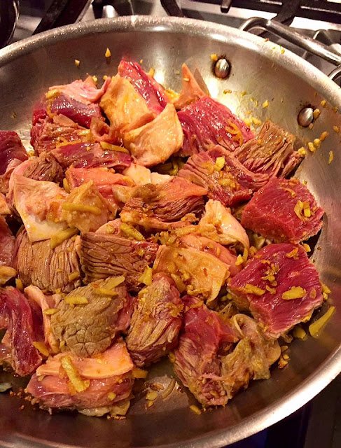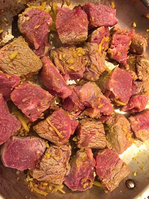 Divide the meat into 3 batches if your skillet isn’t large enough for one batch. Heat a tablespoon of annatto oil in a skillet. Add ginger, garlic and shallots and stir until slightly golden brown. Add the beef and stir until seared.