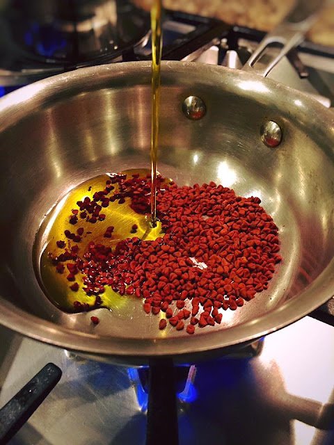 Heat the oil and annatto seeds in a sauce pan over low heat for about 2-3 minutes. As the temperature rises, the red color will leach from the annatto seeds. Let it cool down for a few minutes, then strain and discard seeds. Store it in a jar for later use.