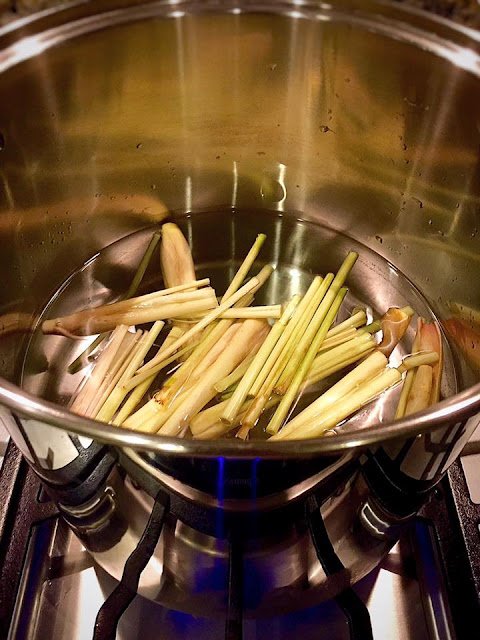 Bring a pot of water and 3/4 of lemongrass to a boil.
