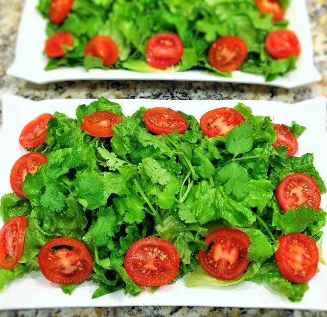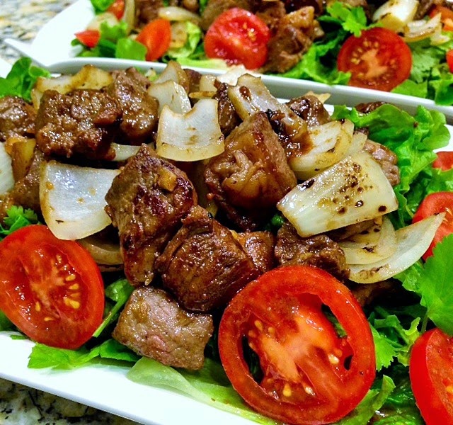 I love serving this dish with lettuce and assorted vegetables especially in the spring and summer time. This dish is as tasty as it is beautiful. The charred cubes of beef are arranged on top of a bed of green lettuce or watercress surrounded with gorgeous red tomatoes. To add more protein and color, you can – like I sometimes do – scattered some slices of hard-boiled eggs.