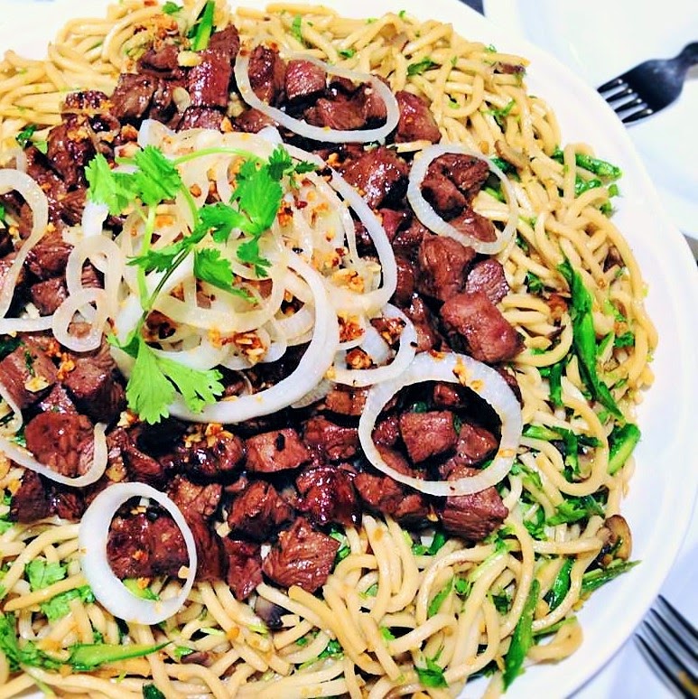 The other day, I served my family this Bò Lúc Lắc on a bed of garlic egg noodle mixed with asparagus and mushroom for dinner. I know a dish is good when I don’t have to constantly remind my girls to finish their plates.