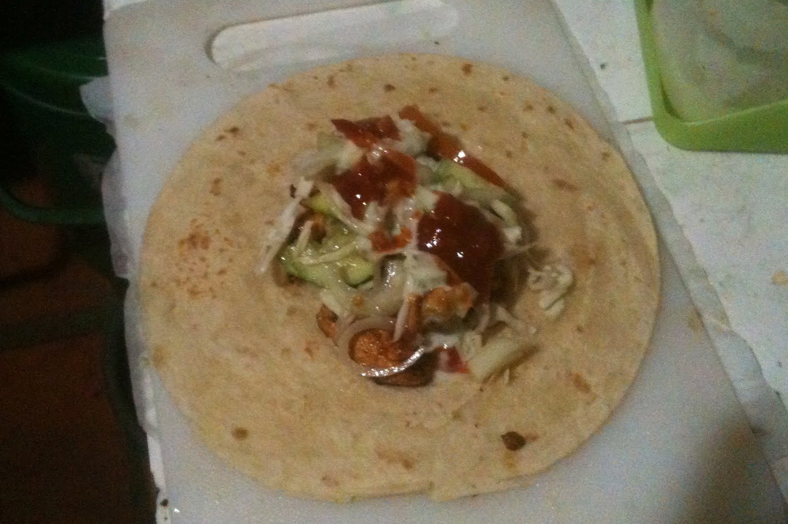Then I tried a prototype. I got the largest frying pan smoking over the hob, dripped in some oil and there was an explosion of flames as I threw in a handful of chicken. After three minutes I let the chicken rest as I heated the smaller frying pan and toasted the tortilla wraps until they were puffy and slightly scorched.
