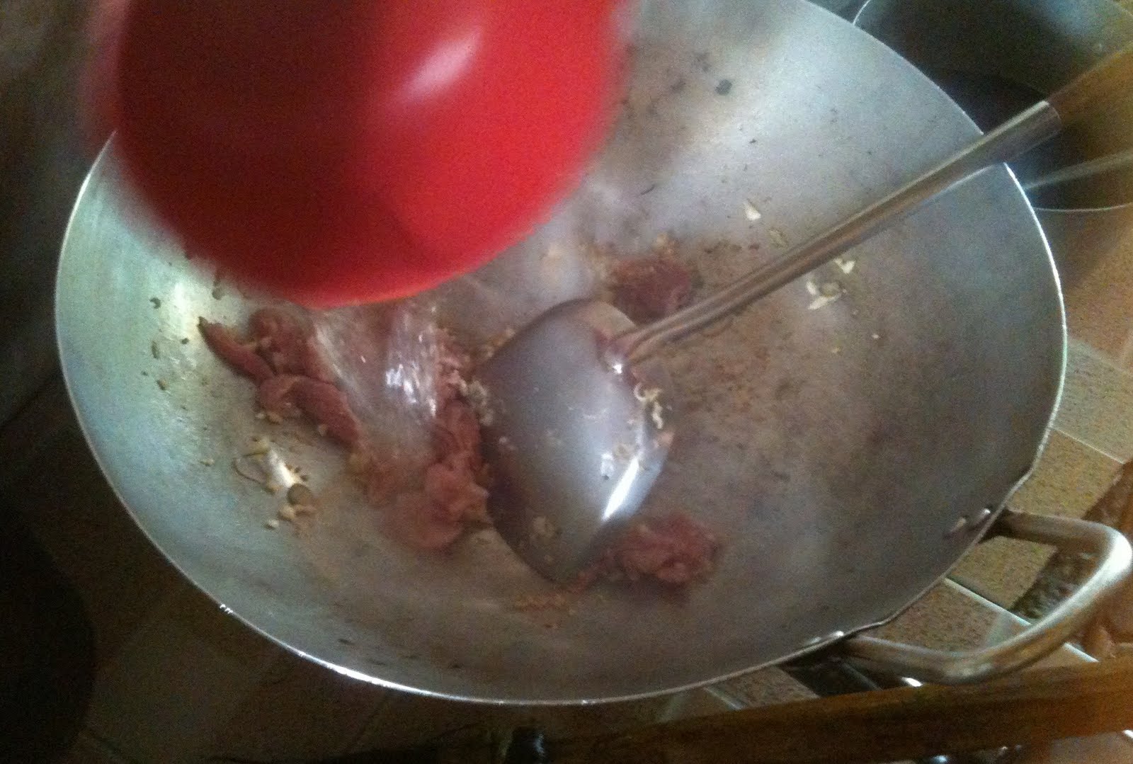 He fried the lemon grass for 20 seconds, and then tossed in the pork, stirred it for a second, and then added a splash of water, and stirred again.