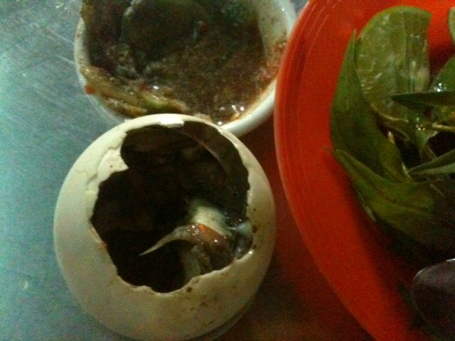 The eggs had been steamed over a charcoal burner, and were piping hot. We held them with paper napkins as we cracked open the shells and looked at the strange life form inside. I’d tried them before, but hadn’t looked too closely. I’d just shut my eyes, whacked the thing in my mouth, and swallowed as quickly as I could, trying to banish the thought of dark feathers tickling my tonsils, and beak crunching between my teeth. Then I downed a tequila.