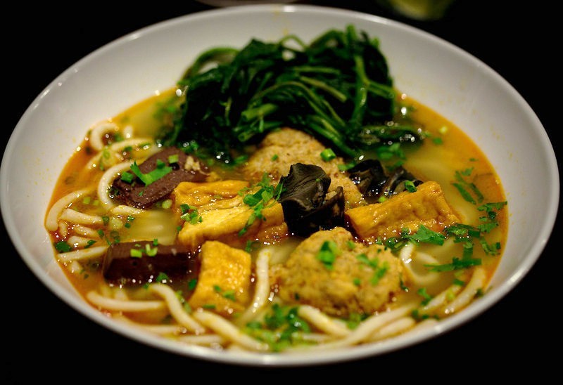 At first glimpse of a pot of Canh Bún, many people may mistaken it with Bún Riêu (Crab Noodle Soup). Similar to Bún Riêu, they both originated from Northern Vietnam but this dish is definitely different in taste and texture. Canh Bún’s broth and riêu (crab mixtured) are much lighter. Canh Bún’s riêu is soft and fluffy while Bún Riêu’s riêu is sturdy. In addition, it doesn’t have tomatoes; the noodles are thicker and they have the reddish color once cooked in the broth and eaten with boiled water spinach or rau muống.