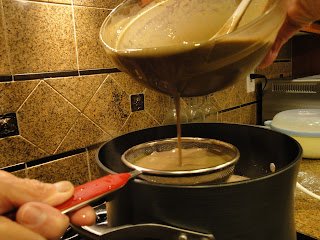 In a separate pot, bring broth, a couple teaspoons of annatto oil and noodle to boil.