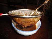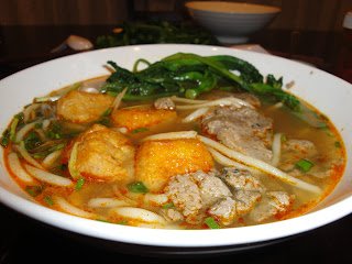 This is one of the dishes that I used to enjoy in the afternoons in Saigon as a kid. I couldn’t recall all the condiments in Canh Bún but I do always remember a distinctive reddish broth, thick noodles, fried tofu, huyết (conjealed blood), fried tofu and the main ingredient riêu made of field crab paste (cua đồng xay) and rau muống. As you know these are usually sold as street foods on carts or carried throughout the neighborhood in đồng gánh (bask̀ets). Everytime the lady with Canh Bún came by, the extremely fragnant broth would turn in me into Povlav’s dog.