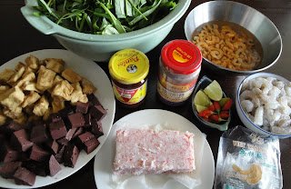 Add fried tofu pouches and conjealed blood cubes. Add at least 2 tablespoons of shrimp paste,
