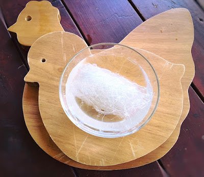Soak the noodle in a bowl of warm water until soft. Remove noodle from the water bowl. Drain. Cut noodle into shorter strings.