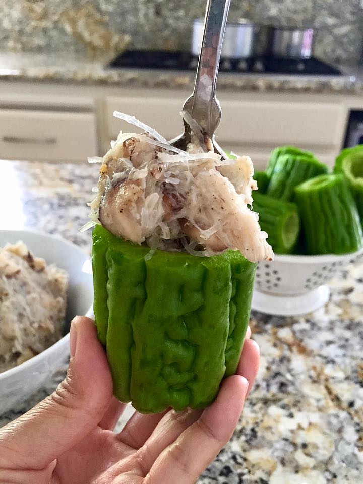Bitter melon is definitely an acquired taste. The really bitter ones can startle your taste buds if you didn’t grow up with it. When I was a kid, my family often prepared bitter melon in our meals and I hated it. It’s acrid and sharp on the tongue and I refused to eat it. When I became an adult, I realized how much health benefits is packed into this bitter melon, so I decided to acquire the taste. After a few tries, I am now fond of its unique bitterness. Served in a light, hearty broth with steamed rice, it’s quite delicious, refreshing, and addicting. Once you warm up to it’s unique bitterness, it opens up your repertoire as you can be creative with the stuffing.