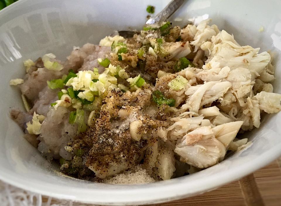 In a mixing bowl, combine shrimp paste, crab meat, noodle, mushrooms, white parts of green onion, black pepper, salt, a bit of fish sauce, sugar, garlic powder. Mix well. A very quick way to taste test the seafood mixture is taking a teaspoonful of the mixture and set in on a plate and nuke it for 20 seconds. Let it cool a bit and then taste what you have so far. Adjust the seasonings to taste.